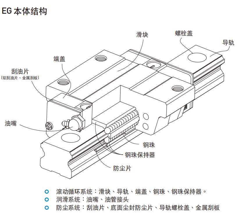 滑块上设有钢珠保持器以防止钢珠脱落,此设计不仅方便客户安装直线导轨,当取下滑块时亦不会有钢珠脱落的情形发生,且在精度允许下具备互换性。